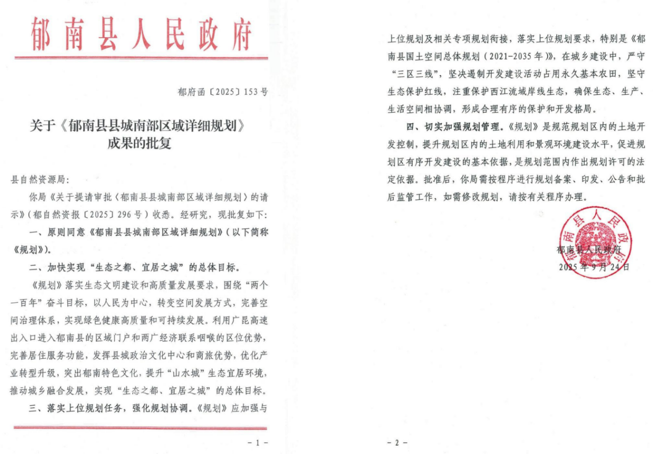 郁南縣人民政府關(guān)于《郁南縣縣城南部區(qū)域詳細(xì)規(guī)劃》成果的批復(fù)(郁府函〔2025〕153號(hào))