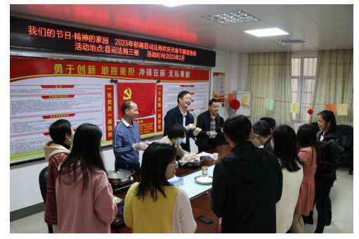 為進(jìn)一步弘揚(yáng)中國(guó)傳統(tǒng)文化,傳播社會(huì)主義核心價(jià)值觀,豐富局機(jī)關(guān)干部文化生活,活躍節(jié)日氣氛,讓大家度過(guò)一個(gè)溫馨、愉悅的元宵佳節(jié),2月2日,郁南縣司法局開(kāi)展了“我們的節(jié)日·精神的家園”主題活動(dòng)??h司法局黨組書(shū)記、局長(zhǎng)賴偉強(qiáng)同志出席了本次活動(dòng)。