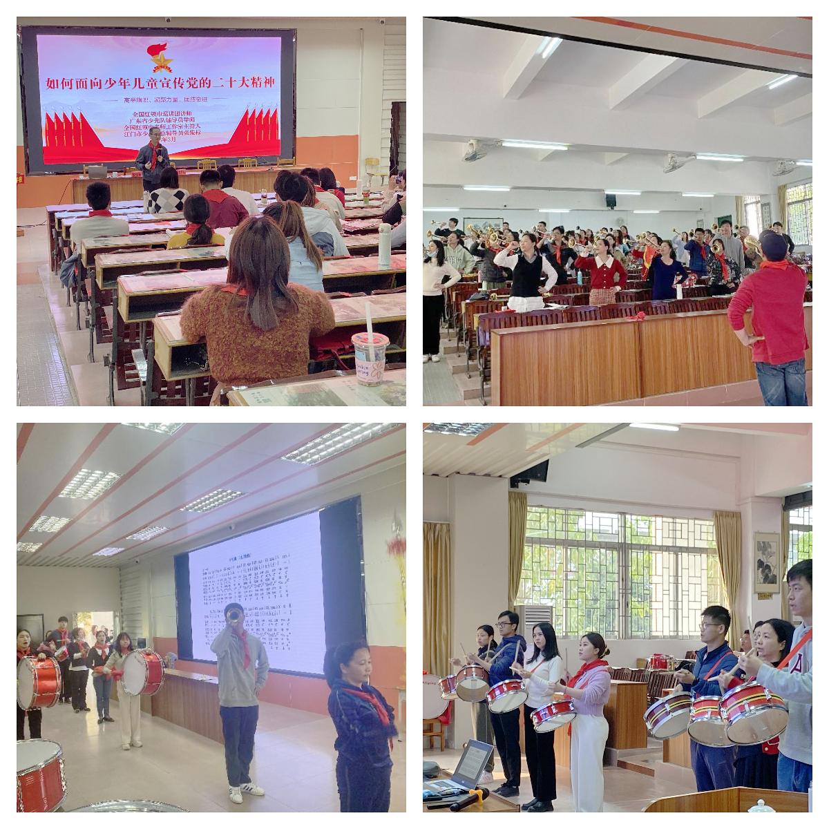 本次培訓(xùn)活動(dòng)邀請(qǐng)廣東省少先隊(duì)鼓號(hào)教練員,廣東省少隊(duì)輔導(dǎo)員初級(jí)導(dǎo)師,廣東省紅領(lǐng)巾巡講團(tuán)成員高家新老師和張俊標(biāo)老師授課,主要采用“理論+實(shí)踐”的方式,培訓(xùn)內(nèi)容包括少先隊(duì)基礎(chǔ)業(yè)務(wù)知識(shí)和鼓號(hào)隊(duì)的演奏方法、樂(lè)理知識(shí)、規(guī)范動(dòng)作等。各學(xué)員們認(rèn)真細(xì)致、全神貫注,積極地投入到緊張的訓(xùn)練中。