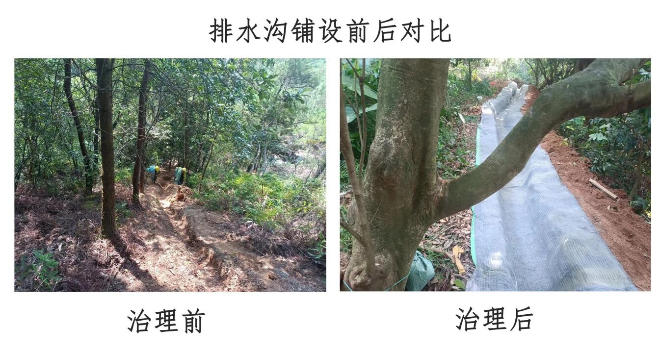 該項目于去年開始謀劃,今年6月8日正式開工,自謀劃項目開始,通過前期調(diào)研、座談交流、現(xiàn)場查看等方式,經(jīng)設(shè)計單位前期充分論證,確定治理措施。根據(jù)宋桂鎮(zhèn)崩崗多、危害大的實際,廣東水科院勘測設(shè)計院在設(shè)計過程中采取“上截、中擋、下欄”的治理模式。用植物柔性壩體技術(shù)替代傳統(tǒng)治理方式中“中削”,可以達到完成治理的同時極大降低成本的效果。對于排水溝材料,選擇當下較新的水泥毯鋪設(shè),具有成本低、效果好、維護方便的特點。