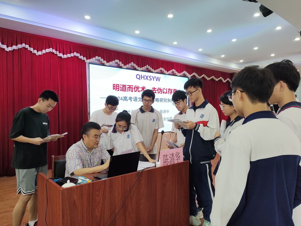上午,陳清華老師作了題為《明道而優(yōu)術,去偽以存真——2024高考語文應考方略研究和行動路徑》的語文專題講座。陳老師從身邊努力學習并成功考上大學的例子入手,提振了學生的備考信心。接著,他從高考命題原則、真題分析、命題指向、應考理念、應考“鐵律”等方面展開指導,用幽默風趣的語言向同學們講述了學好語文的重要性,并結(jié)合最新的、最具有代表性的模擬試題解析的備考思維和應考要訣,深入而又細致地從宏觀備考策略到微觀解題思路向與會師生講解了高考語文的各版塊考查要點。