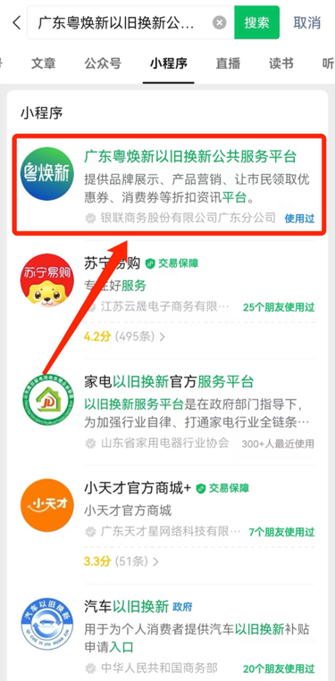 步驟1打開微信APP搜索“廣東粵煥新以舊換新公共服務(wù)平臺(tái)”