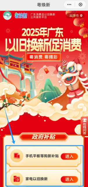 步驟3定位到所在地后,選擇“手機(jī)平板等購(gòu)新補(bǔ)貼”并點(diǎn)擊“進(jìn)入”