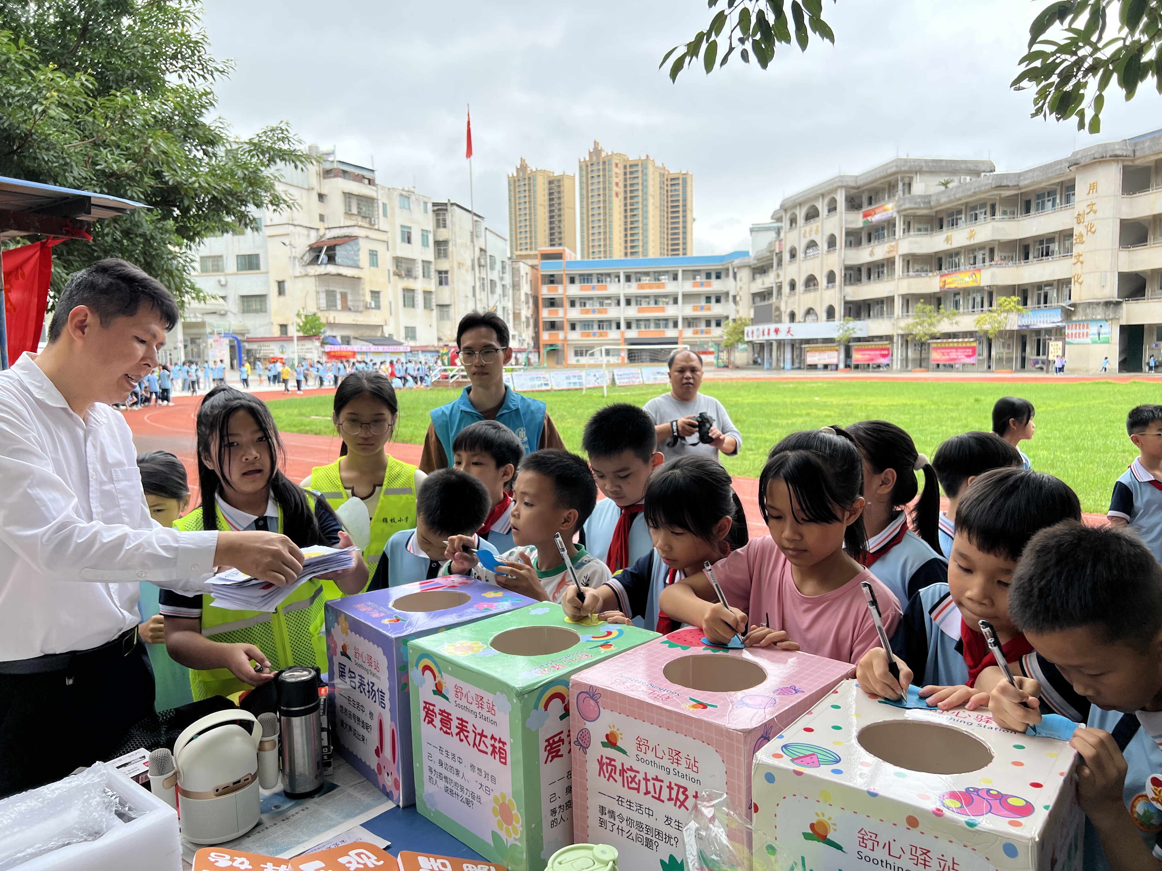 本次活動邀請錦枝小學的心理老師精心設計,以滋養(yǎng)孩子心靈、釋放節(jié)日快樂的心理輔導為內(nèi)容,將兒童心理健康的理念播撒在節(jié)日的快樂之下?;顒訁^(qū)域精心設置了多個寓教于樂的游戲點位,“情緒猜猜樂”讓孩子們通過表情和肢體語言傳遞情緒密碼,深化對情緒的理解;“合作運球”強調(diào)團隊力量,在共同目標中感受信任與支持的珍貴;“勇氣挑戰(zhàn)賽”鼓勵孩子們突破自我設限,體驗突破自我的成就感;“心靈寄語”則提供一個表達內(nèi)心祝福和期許的溫暖角落。每個點位都巧妙融入了心理健康元素,孩子們在暢快游戲的同時,潛移默化地吸收著健康心理的養(yǎng)分?! ?/p>