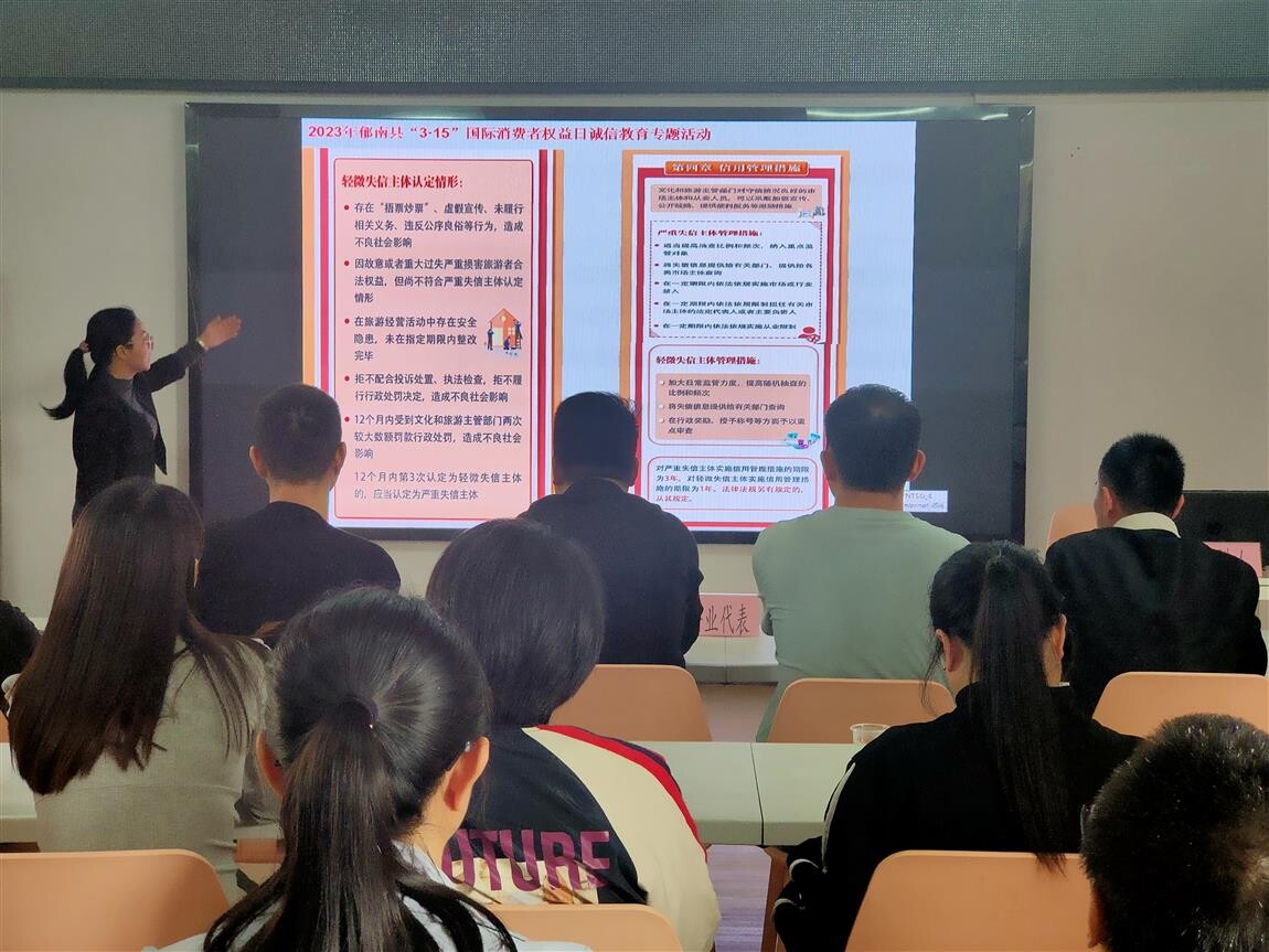 為積極營造安全放心的消費(fèi)環(huán)境,更好地維護(hù)消費(fèi)者合法權(quán)益,維護(hù)穩(wěn)定的社會經(jīng)濟(jì)秩序,3月15日,郁南縣文廣旅體局舉辦了2023年郁南縣“3·15”國際消費(fèi)者權(quán)益日誠信教育專題活動——“倡導(dǎo)誠信經(jīng)營 提振消費(fèi)信心”主題宣講活動,縣城轄區(qū)內(nèi)文化娛樂場所、網(wǎng)吧、旅行社、星級飯店、A級景區(qū)等文化旅游經(jīng)營單位負(fù)責(zé)人參加。