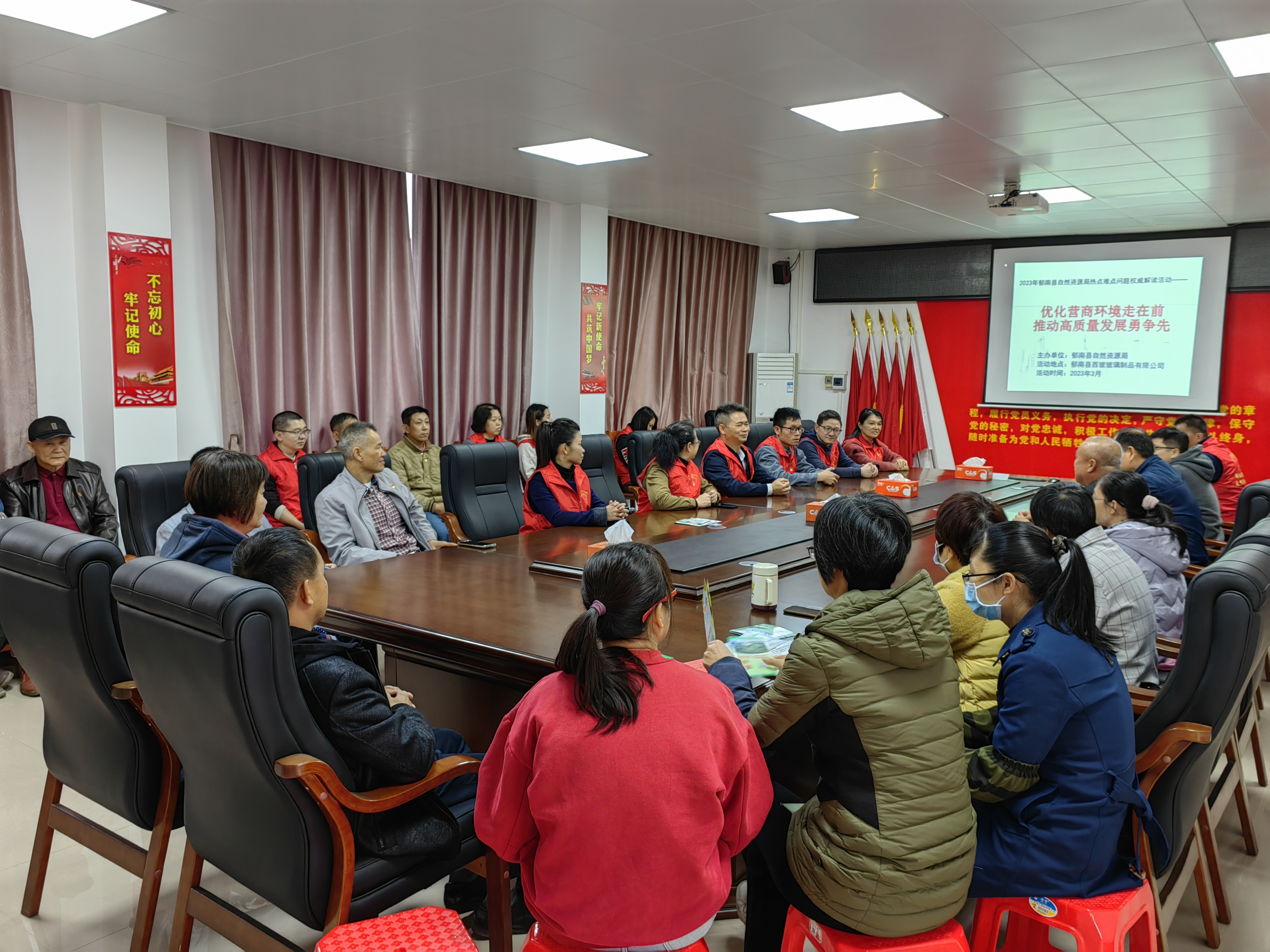 3月28日,在黨委副書記陳恒馨、梅樹禧的帶領(lǐng)下,縣自然資源局黨員干部及股室志愿者共15人前往郁南縣西玻玻璃制品有限公司二樓黨建活動室開展主題為“優(yōu)化營商環(huán)境走在前 推動高質(zhì)量發(fā)展勇爭先”熱點問題權(quán)威解讀活動。縣西玻玻璃制品有限公司黨支部黨員參加了活動。