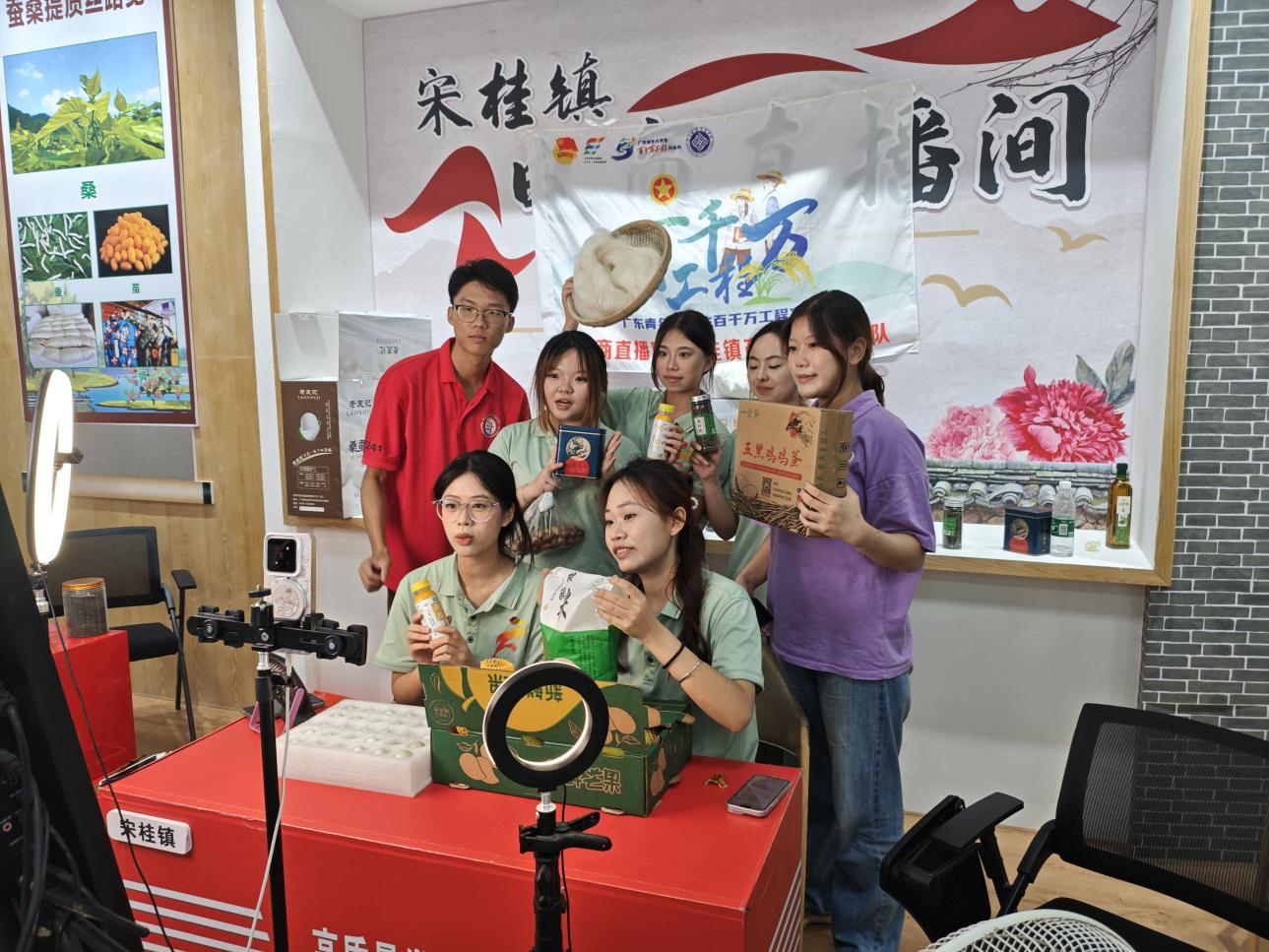 近日,共青團郁南縣宋桂鎮(zhèn)委、宋桂鎮(zhèn)鄉(xiāng)村振興辦在該鎮(zhèn)美麗圩鎮(zhèn)客廳牽頭舉辦直播活動,邀請廣東職業(yè)技術(shù)學(xué)院電商助農(nóng)突擊隊成員擔(dān)任主播?;顒诱故玖嗽撴?zhèn)特色的蠶桑制品、吊絲單竹筍、金煌芒等農(nóng)副產(chǎn)品,其中一禽軒五黑雞雞蛋憑借其獨特的綠色蛋殼,成為直播間的“人氣王”,引起觀眾廣泛關(guān)注。