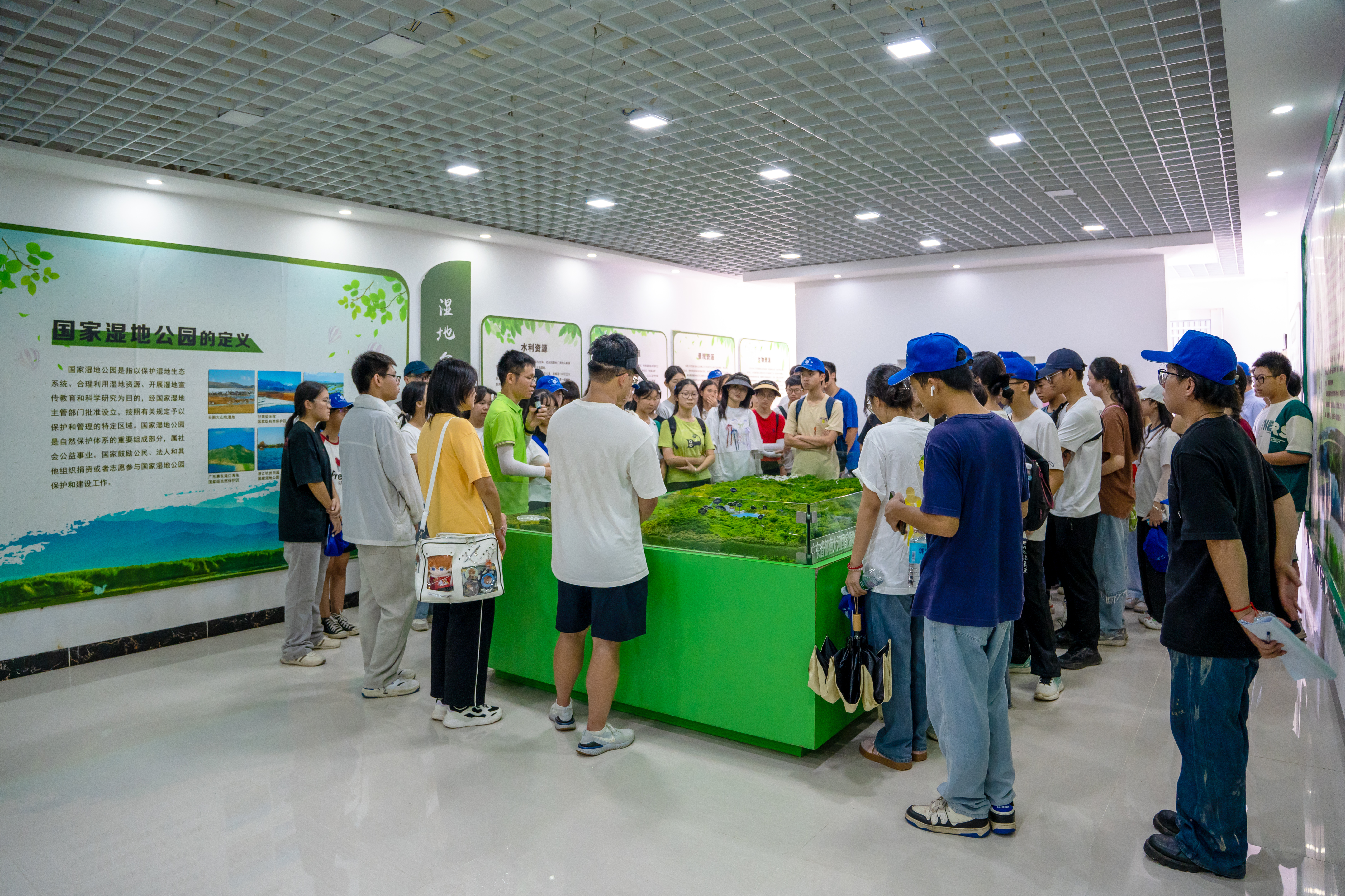 啟動儀式上,郁南縣副縣長楊桂平介紹了郁南縣近年來綠美生態(tài)建設(shè)成果和本次活動目的意義。市科協(xié)主席陳華堅為活動致辭,強調(diào)了科普活動和濕地保護的重要性,鼓勵青年大學(xué)生要積極投入到濕地保護的行動中來,營造“綠美廣東青年先行”的良好氛圍。隨后,同學(xué)們在講解員的帶領(lǐng)下參觀大河國家濕地公園宣教中心。通過各類濕地內(nèi)容的展板、栩栩如生的標本以及清晰直觀的沙盤展示等內(nèi)容,全方位了解大河濕地公園的發(fā)展歷程、生態(tài)現(xiàn)狀以及未來規(guī)劃。同學(xué)們邊看邊聽,對濕地生態(tài)有了更直觀、更深刻地理解。
