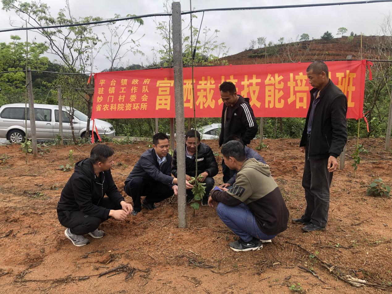 驛站專家和工作隊(duì)幫助返鄉(xiāng)后的申老板牽線引路,幫助其很快確定了項(xiàng)目基地選址——位于妙門村的六利山頭,并鏈接省科院科技特派員團(tuán)隊(duì)技術(shù)支持,指導(dǎo)申老板以“黨支部+駐站專家+科技特派員+合作社+大戶+基地”的合作模式共同打造了富硒果種植基地,并為基地命名“妙門紅”,寓意妙門村未來發(fā)展紅紅火火,也象征著鎮(zhèn)村打造“紅色黨建+綠色經(jīng)濟(jì)發(fā)展”品牌的決心。