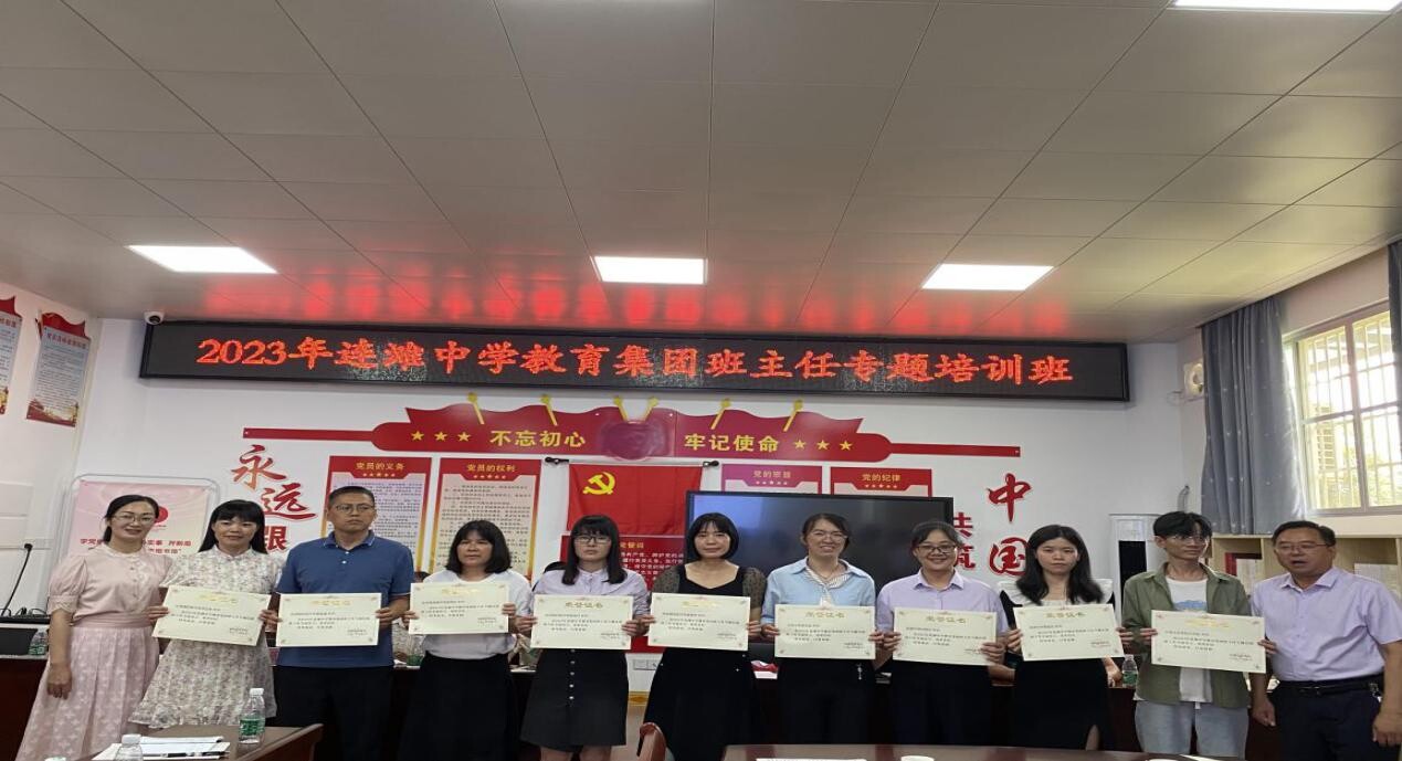 為進一步加強班主任隊伍建設,提升班主任的專業(yè)素養(yǎng)和管理水平,5月19日上午,連灘中學在黨建活動室舉行2023年連灘中學教育集團班主任專題培訓。郁南縣教育局德育股負責人周紅芬、集團總校長劉興華、連灘中學德育管理干部和班主任、云安縣白石中學10位管理干部及連灘中學教育集團各成員學校德育副校長和班主任代表參加,政教處副主任區(qū)順柱主持。