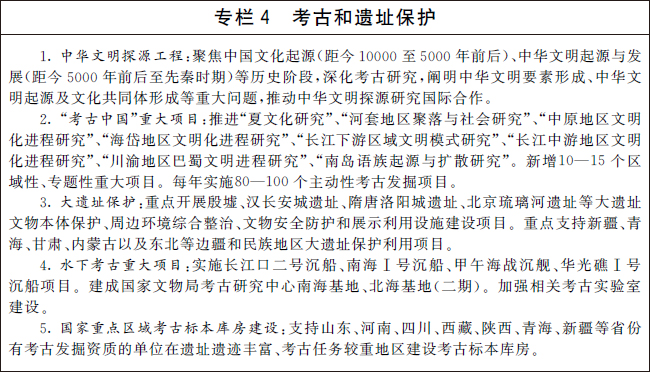 注:① “四有”工作是指劃定必要的保護范圍、作出標志說明、建立記錄檔案、設置專門機構或專人管理。 ?、?“兩線”是指保護范圍和建設控制地帶。 ③ 12.27億人次為2019年數(shù)據(jù),2020年受新冠肺炎疫情影響,年觀眾人數(shù)為5.4億人次。 展望2035年,我國將建成與文化強國建設目標相適應的文物保護管理工作體系,科技創(chuàng)新、人才隊伍建設有力支撐文物保護研究利用,考古成果實證我國一萬年的文化史、五千多年的文明史,博物館強國建設成效顯著,紅色基因得到有效傳承,根植于深厚歷史文化遺產的中華文化影響力大幅提升,民族文化自信顯著增強。 三、強化文物資源管理和文物安全工作 堅持以確保文物資源安全為核心,統(tǒng)籌做好各級各類文物資源管理工作,增強防護能力,加強執(zhí)法督察,嚴厲打擊和防范文物犯罪,守牢文物安全底線。 ?。ㄒ唬┙∪奈镔Y源管理體制。 完善文物登錄制度,健全文物調查、申報、認定、登記、定級、公布、降級和撤銷程序,梳理明確文物法定命名體系,建立國家文物資源總目錄并與中華文化資源普查工程做好銜接。完善不可移動文物資源管理機制,核定并公布第九批全國重點文物保護單位,推進根據(jù)文物普查、專項調查成果認定不可移動文物。在國土空間規(guī)劃中落實保護不可移動文物的空間管制措施,統(tǒng)籌劃定文物保護單位保護范圍和建設控制地帶、地下文物埋藏區(qū)、水下文物保護區(qū)等,納入國土空間規(guī)劃“一張圖”。完善可移動文物資源管理機制,健全博物館藏品征集、登記、定級機制,做好民間收藏文物調查,開展流失海外文物資源專項調查,優(yōu)化考古出土文物、涉案文物移交制度。開展革命文物資源調查。加強對軍隊文物、工業(yè)遺產、農業(yè)文化遺產、水利遺產、科技遺產的保護。由住房城鄉(xiāng)建設部牽頭,會同國家文物局進一步完善歷史文化名城名鎮(zhèn)名村、歷史文化街區(qū)、歷史建筑保護機制。 ?。ǘ┙ㄔO國家文物資源大數(shù)據(jù)庫。 系統(tǒng)整合全國不可移動文物資源數(shù)據(jù)庫、國有可移動文物普查數(shù)據(jù)庫、革命文物數(shù)據(jù)庫等,加強文物資源大數(shù)據(jù)應用。將文物資源空間信息納入國土空間基礎信息平臺。加強文物數(shù)字化保護,以世界文化遺產、全國重點文物保護單位、館藏一級文物等為重點,推進相關文物信息高清數(shù)據(jù)采集和展示利用。完善全國考古發(fā)掘信息管理系統(tǒng)。建立文物數(shù)字化標準規(guī)范體系,健全數(shù)據(jù)管理和開放共享機制,加大文物數(shù)據(jù)保護力度。支持國家和省級文物數(shù)據(jù)中心、重點文博單位信息基礎設施建設,加強文物領域新型基礎設施建設。 ?。ㄈ┙∪奈锇踩L效機制。 將文物安全工作全面納入地方各級政府考核評價體系,探索推行“文物長制”,建立健全文物安全責任體系,完善部門協(xié)作共商機制,加強信息共享,實施文物安全直接責任人公告公示制度。健全文物安全制度標準體系,提高安全防護設施建設和管理維護水平。建立重點文博單位安全風險評估和預警機制,實施風險等級管理,有效防范火災、人員擁擠踩踏等事故發(fā)生。加強文博單位治安防范,持續(xù)開展打擊文物犯罪專項行動,完善打擊和防范文物犯罪聯(lián)合長效機制。開展文物火災隱患排查整治行動和地震、地質災害、洪澇等方面的自然災害綜合風險排查,實施抗震加固、地質災害防控等工程,建立健全文物災害綜合風險監(jiān)測和評估制度,明確文物消防、防洪安全責任,加強消防設施、消防水源、消防車通道、防洪除澇設施和應急處置力量建設,強化火災、洪澇風險辨識與管控,推廣科學適用的技防物防措施,提升應急管理水平,增強防控能力。 ?。ㄋ模娀奈镄姓?zhí)法督察。 加強文物督察力量,開展國家文物督察試點,加大文物督察科技支撐力度,持續(xù)實施專項督察和聯(lián)合督察。強化省級文物行政部門督察職責,落實市、縣文化市場綜合執(zhí)法隊伍文物行政執(zhí)法責任,強化文物行政部門、文化市場綜合執(zhí)法隊伍執(zhí)法協(xié)作。完善文物行政執(zhí)法案例指導、案卷評查、行政執(zhí)法與刑事司法銜接、社會監(jiān)督機制。規(guī)范文物違法舉報流程,加大重大違法案件責任追究力度。 ?。ㄎ澹┨岣呶奈锇踩c執(zhí)法督察科技水平。 實施文物平安工程,加大古遺址、古墓葬、石窟寺石刻等防盜竊盜掘預警技術研發(fā)應用和相關裝備配置力度。加強博物館和文物建筑等火災防控、洪澇監(jiān)測預警、地震和地質災害防控信息技術應用和應急管理體系建設。加強衛(wèi)星遙感、無人機、大數(shù)據(jù)等科技手段在文物安全監(jiān)測和執(zhí)法督察中的應用。 四、全面加強文物科技創(chuàng)新 堅持科技創(chuàng)新引領,遵循文物保護和考古特點規(guī)律,加大要素投入力度,優(yōu)化資源配置,加強多學科協(xié)同,構建產學研用深度融合的文物科技創(chuàng)新體系,推進行業(yè)標準體系建設,提升文物科技創(chuàng)新能力和文物領域科技應用水平,帶動解決重點難點和瓶頸問題,支撐引領文物事業(yè)高質量發(fā)展。 ?。ㄒ唬┥罨A研究。 面向文物保護利用基礎理論需求、關鍵科學問題,部署基礎研究重點任務,促進數(