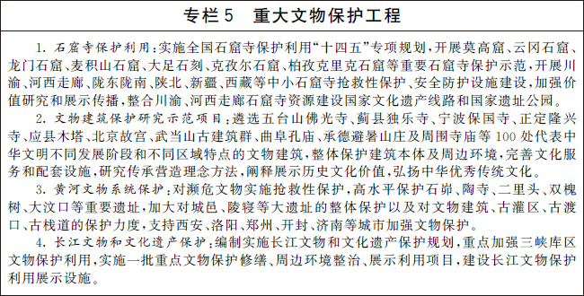 國務院辦公廳關于印發(fā)“十四五”文物保護和科技創(chuàng)新規(guī)劃的通知 國辦發(fā)〔2021〕43號 各省、自治區(qū)、直轄市人民政府,國務院各部委、各直屬機構: 《“十四五”文物保護和科技創(chuàng)新規(guī)劃》已經國務院同意,現(xiàn)印發(fā)給你們,請認真貫徹執(zhí)行。 國務院辦公廳 2021年10月28日 (此件公開發(fā)布) “十四五”文物保護和科技創(chuàng)新規(guī)劃 為貫徹習近平總書記關于文物工作的重要指示批示精神,加強“十四五”時期文物保護和科技創(chuàng)新工作,根據(jù)《中華人民共和國文物保護法》、《中華人民共和國國民經濟和社會發(fā)展第十四個五年規(guī)劃和2035年遠景目標綱要》和黨中央、國務院決策部署,制定本規(guī)劃。 一、發(fā)展環(huán)境 “十三五”時期,各地區(qū)各部門扎實推進文物工作,文物事業(yè)取得顯著進步。完成第一次全國可移動文物普查,登錄國有可移動文物1.08億件/套。國務院核定并公布第八批全國重點文物保護單位。文物保存狀況持續(xù)改善,安全形勢總體平穩(wěn)。文物領域科學研究和技術創(chuàng)新取得重要進展??脊藕蜌v史研究成果豐碩。革命文物保護利用全面加強。博物館事業(yè)高速發(fā)展,社會文物管理改革穩(wěn)步推進。文物活化利用不斷深入,文物保護的社會共識逐漸加深。文物國際交流合作向縱深拓展,我國在國際文化遺產領域影響力與日俱增。文物保護法律制度日臻完善,保護管理力量不斷加強,治理能力和治理水平有所提升,黨委領導、政府負責、部門協(xié)同、社會參與的工作格局不斷完善,文物事業(yè)為弘揚中華優(yōu)秀傳統(tǒng)文化、凝聚共筑中國夢磅礴力量作出重要貢獻。 “十四五”時期是我國開啟全面建設社會主義現(xiàn)代化國家新征程的第一個五年,也是推進社會主義文化強國建設、推動實現(xiàn)從文物資源大國向文物保護利用強國跨越的關鍵時期。國際環(huán)境日趨復雜,不確定性顯著增加,需要發(fā)揮好文物工作獨特優(yōu)勢,展示真實立體全面的中國,增強中華文化影響力,為構建人類命運共同體貢獻力量。文物事業(yè)發(fā)展處于重要戰(zhàn)略機遇期,文物工作使命光榮、責任重大。我國進入高質量發(fā)展階段,文物安全形勢依然嚴峻,保護管理機構隊伍和專業(yè)力量依然薄弱,文物科技創(chuàng)新能力和應用水平亟待提升,考古在實證中華文明史和文化研究方面的作用亟待強化,文物保護利用不平衡不充分問題依然存在,文物資源管理、價值闡釋、執(zhí)法督察、民間收藏等重點領域改革任務依然艱巨。 二、總體要求 ?。ㄒ唬┲笇枷?。 高舉中國特色社會主義偉大旗幟,堅持以習近平新時代中國特色社會主義思想為指導,深入學習貫徹黨的十九大和十九屆二中、三中、四中、五中全會精神,認真貫徹落實習近平總書記關于文物工作的重要指示批示精神,增強“四個意識”、堅定“四個自信”、做到“兩個維護”,立足新發(fā)展階段、貫徹新發(fā)展理念、構建新發(fā)展格局,圍繞舉旗幟、聚民心、育新人、興文化、展形象的使命任務,貫徹“保護為主、搶救第一、合理利用、加強管理”的文物工作方針,以推動文物事業(yè)高質量發(fā)展為主題,以深化文物保護利用改革為主線,以強化文物科技創(chuàng)新和人才隊伍建設為動力,全面加強文物保護研究利用,全面深化對中華文明的認知,全面提升中華文化影響力,全面推進文物治理體系和治理能力現(xiàn)代化,穩(wěn)中求進、守正創(chuàng)新,走出一條符合國情的文物保護利用之路,為實現(xiàn)中華民族偉大復興的中國夢作出更大貢獻。 ?。ǘ┗驹瓌t。 ——堅持黨的全面領導。堅持馬克思主義在意識形態(tài)領域指導地位的根本制度,堅持和完善黨領導文物事業(yè)發(fā)展的體制機制,牢固樹立保護文物也是政績的科學理念,發(fā)揮黨在文物工作中總攬全局、協(xié)調各方的領導作用,為實現(xiàn)文物事業(yè)高質量發(fā)展提供根本保證。 ——堅持以人民為中心。廣泛動員社會力量參與文物保護利用,積極推動文物保護利用融入人民群眾生產生活,做到文物保護利用為了人民、依靠人民,不斷滿足人民日益增長的美好生活需要,增強人民精神力量。 ——堅持依法保護利用。始終把保護放在第一位,健全文物保護利用法律制度、執(zhí)法機制,落實各級政府主體責任,嚴守文物安全紅線,確保文物本體安全,維護文物周邊環(huán)境安全,提升全社會文物保護法治意識。 ——堅持科技創(chuàng)新引領。樹牢文物保護要依靠科技的發(fā)展理念,改善文物科技創(chuàng)新生態(tài),持之以恒加強基礎研究,加快推進急需技術攻關和應用,加強人才培養(yǎng)和跨學科合作,推動文物保護利用提質增效。 ——堅持深化改革。全面深化文物領域各項改革,加強文物保護和考古力量建設,合理保障人員待遇,破解制約文物作用更好發(fā)揮的瓶頸問題,強化有利于提高資源配置效率、有利于調動全社會積極性的改革舉措,讓文物活起來,激發(fā)文化創(chuàng)新創(chuàng)造活力。 ——堅持系統(tǒng)觀念。統(tǒng)籌發(fā)展和安全,統(tǒng)籌中央、地方和各方力量,統(tǒng)籌保護和利用,著力補短板強弱項,統(tǒng)籌加強考古、文物保護、安全防范、研究、展示、傳播力量,加快構建文