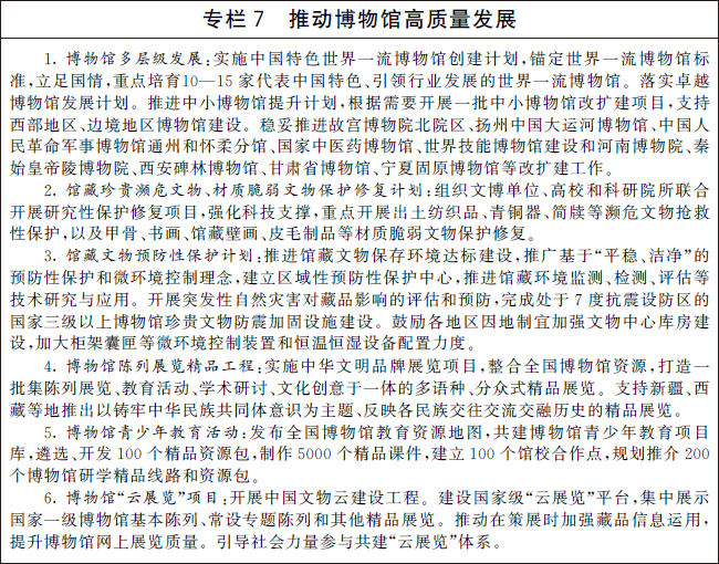 七、加強革命文物保護管理運用 堅持保護第一,充分發(fā)揮革命文物在黨史學習教育、革命傳統(tǒng)教育、愛國主義教育等方面的重要作用,用好紅色資源、賡續(xù)紅色血脈、弘揚革命文化、汲取奮進力量。 ?。ㄒ唬┘哟蟾锩奈锉Wo力度。 系統(tǒng)開展革命文物和相關史料調查征集。加強科學保護、系統(tǒng)保護,進一步完善革命文物定期排查、日常養(yǎng)護管理和安全防范制度,實施一批革命舊址維修保護項目、館藏革命文物保護修復項目和革命文物研究性保護項目。加強整體保護,推進革命文物保護利用片區(qū)整體規(guī)劃、連片保護、統(tǒng)籌展示,發(fā)揮示范引領作用。持續(xù)改善各級各類不可移動革命文物保存狀況。 ?。ǘ┨嵘锩奈镎故舅?。 優(yōu)化革命博物館、紀念館區(qū)域布局,指導支持一批革命博物館、紀念館展陳提升項目,加強中國共產黨歷史文物保護展示。認真總結慶祝中國共產黨成立100周年革命文物陳列展覽成功經驗,結合紀念辛亥革命110周年、紅軍長征勝利85周年、中華人民共和國成立75周年、中國人民抗日戰(zhàn)爭勝利80周年、中國人民志愿軍抗美援朝出國作戰(zhàn)75周年等重要時間節(jié)點,堅持政治性思想性藝術性相統(tǒng)一,策劃推出革命文物陳列展覽精品。合理運用現(xiàn)代科技手段,增強革命文物陳列展覽表現(xiàn)力、傳播力、影響力。推進革命文物聯(lián)展巡展。 (三)強化革命文物研究闡釋。 整合文物、黨史、軍史、檔案、地方志等方面研究力量,加強革命文物保護利用研究,開展實物、文獻、檔案、史料和口述史征集,挖掘革命文物深刻內涵,推出重要研究成果,旗幟鮮明反對和抵制歷史虛無主義,繼續(xù)發(fā)揚偉大建黨精神,傳承弘揚井岡山精神、長征精神、遵義會議精神、延安精神、西柏坡精神、紅巖精神、抗美援朝精神、“兩彈一星”精神、特區(qū)精神、抗洪精神、抗震救災精神、抗疫精神、脫貧攻堅精神等偉大精神。 ?。ㄋ模┩卣垢锩奈镞\用方式。 提升革命舊址開放水平,完善重要革命紀念地設施。用好革命文物資源,舉辦國家和群眾性紀念活動,積極開展青少年教育活動。創(chuàng)新革命文物宣傳傳播方式,加強革命文物資源網絡空間建設。依托革命文物資源開辟公共文化空間,發(fā)展紅色旅游及紅色研學旅行,打造紅色經典景區(qū)和精品線路,助力鄉(xiāng)村振興和革命老區(qū)振興發(fā)展。 ?。ㄎ澹┥罨锩奈锕ぷ鲀热?。 服務好“四史”學習教育,特別是圍繞中國共產黨各個歷史時期的重大事件、重要節(jié)點,研究確定一批重要標識地,推動有條件的重要建設工程、科學工程、國防工程面向公眾開放,生動展示革命文物蘊含的強大精神力量。 八、激發(fā)博物館創(chuàng)新活力 堅持公益屬性,突出社會效益,統(tǒng)籌不同地域、層級、屬性、類型博物館發(fā)展,提高博物館公共服務均等化、便捷化、多樣化水平,做好常態(tài)化疫情防控工作,不斷推進博物館改革發(fā)展。 ?。ㄒ唬﹥?yōu)化博物館布局。 實施中國特色世界一流博物館創(chuàng)建計劃。支持省級、重要地市級博物館特色化發(fā)展。盤活基層博物館資源。探索建立行業(yè)博物館聯(lián)合認證、共建共管機制。規(guī)范和扶持非國有博物館發(fā)展,落實支持政策,依法依規(guī)推進非國有博物館法人財產權確權。認真履行相關審批程序,有序推動建設一批反映黨和國家建設成就的當代主題博物館和行業(yè)博物館,重點支持建設反映中華文明發(fā)展歷程的國家級重點專題博物館,倡導建設特色專題博物館。探索在文化資源豐厚地區(qū)建設“博物館之城”。 ?。ǘ┖粚嵅┪镳^藏品保護管理基礎。 提升博物館藏品管理能力,健全藏品登錄機制,推進藏品檔案標準化、信息化建設,逐步推廣藏品電子標識。實施館藏珍貴瀕危文物、材質脆弱文物保護修復計劃,寓科學研究于保護修復全過程,提高館藏文物保護修復水平。強化預防性保護,充分運用科學研究成果和環(huán)境監(jiān)測數(shù)據(jù),改善博物館藏品保存環(huán)境,推動多元化、低成本、高效能的藏品保存設施設備體系建設。加快推進博物館藏品數(shù)字化,完善藏品數(shù)據(jù)庫,加大基礎信息開放力度。 (三)提升博物館服務能力。 提升博物館展陳質量,加強對藏品價值的挖掘闡發(fā)。支持博物館聯(lián)合辦展、巡回展覽、流動展覽、網上展覽。探索獨立策展人制度,推出更多原創(chuàng)性主題展覽。推介“弘揚中華優(yōu)秀傳統(tǒng)文化、培育社會主義核心價值觀”主題展覽。廣泛深入開展在博物館里過傳統(tǒng)節(jié)日、紀念日活動。制定博物館教育服務標準,豐富博物館教育課程體系,支持大中小學利用博物館開展研學實踐和科普活動等。實施一批智慧博物館建設示范項目,研究制定相關標準規(guī)范。推動博物館發(fā)展線上數(shù)字化體驗產品,提供沉浸式體驗、虛擬展廳、高清直播等新型文旅服務。 ?。ㄋ模﹦?chuàng)新博物館管理體制機制。 進一步健全博物館免費開放機制。分類推進國有博物館、非國有博物館理事會制度建設,建立健全決策執(zhí)行和監(jiān)督咨詢機制。對于部分符合條件的新建博物館,在不改變藏品權屬、確保安全的前提下,經批準可探索開展國有博物館資產所有權、藏品歸屬權、開放