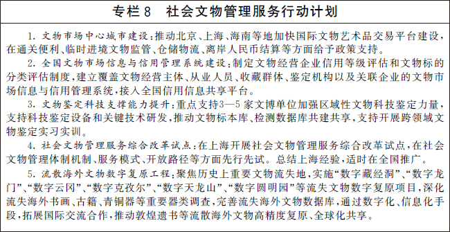 九、優(yōu)化社會文物管理服務 堅持社會效益優(yōu)先,加強對民間收藏的指導、管理和服務,健全文物合法流通交易體制機制,優(yōu)化文物鑒定服務和文物進出境監(jiān)管,完善流失文物追索返還制度。 ?。ㄒ唬┐龠M文物市場健康有序發(fā)展。 營造健康的文物市場環(huán)境,培育現(xiàn)代文物市場體系,優(yōu)化文物市場區(qū)域布局。強化文物商店作用,探索降低文物商店準營門檻,推動國有文物商店改革。培育一批具有市場美譽度和國際影響力的文物拍賣龍頭企業(yè),扶持中小文物經營主體。支持發(fā)展現(xiàn)代經營方式,推動文物市場線上線下融合,支持在線展示、交易和定制服務等新業(yè)態(tài)發(fā)展。完善民間收藏文物登記交易制度,建設全國文物市場信息與信用管理系統(tǒng),完善文物流通信用體系、文物市場全流程協(xié)同監(jiān)管機制。 ?。ǘ┙⒍鄬哟挝奈镨b定服務體系。 加強涉案文物鑒定評估機構建設,做好刑事、民事、行政等領域相關鑒定工作。支持文博單位、社會力量探索成立文物鑒定機構,提供公益性咨詢和經營性活動相結合的鑒定服務。實施文物鑒定職業(yè)技能等級認定。加強文物鑒定基礎研究、科技支撐和人才培養(yǎng),加快科技輔助鑒定聯(lián)合研究與應用推廣。健全罰沒文物接收和指定收藏機制。 ?。ㄈ┨嵘奈镞M出境管理服務水平。 健全文物進出境審核管理體制,加強隊伍和管理能力建設。制修訂文物出境鑒定國家標準,防止珍貴文物流失。探索建立文物進境登記制度。積極研究調整國有公益性收藏單位進口藏品稅收政策。優(yōu)化文物臨時進出境管理服務,支持發(fā)展文物倉儲、展示等衍生業(yè)態(tài)。完善文物進出境風險聯(lián)合防控機制,加強風險布控與執(zhí)法合作。 ?。ㄋ模嫿ㄎ奈镒匪鞣颠€常態(tài)化工作格局。 完善法律法規(guī),做好與相關國際公約銜接,健全部際協(xié)調機制,加強專門力量建設。建立中國非法流失文物信息發(fā)布機制,加強流失海外文物調查監(jiān)測,加強中國被盜文物數(shù)據(jù)庫、外國被盜文物數(shù)據(jù)庫建設,推動敦煌遺書等流失文物數(shù)字化復原與共享。建立“打擊非法販運文化財產國際日”中國主場活動機制,引導社會力量參與。深度參與國際治理,加強雙邊、多邊合作,促進完善國際規(guī)則。