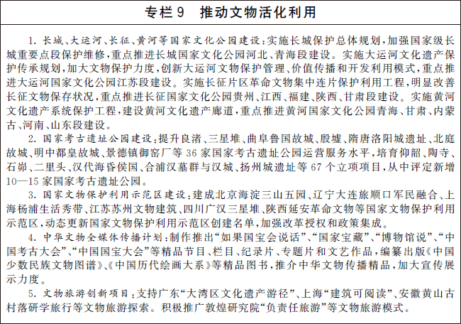 十、大力推進讓文物活起來 堅持創(chuàng)造性轉化、創(chuàng)新性發(fā)展,深入挖掘、廣泛傳播文物蘊含的文化精髓和時代價值,創(chuàng)新文物合理利用方式,塑造全民族歷史認知,推動文物保護利用工作全面融入經濟社會發(fā)展。 (一)依托文物資源推進中華文明標識體系建設。 建設長城、大運河、長征、黃河等國家文化公園,推進長江文物和文化遺產保護利用,強化區(qū)域文物系統(tǒng)保護,加強文物合理利用的協(xié)同創(chuàng)新,以主題明確、內涵清晰、影響突出的系列文物資源為主線,集中打造中華文明重要標識。依托全國重點文物保護單位、世界遺產等,推介國家文化地標和精神標識,試點推廣國家文化遺產線路,促進文物保護研究與文化闡釋傳播。 (二)強化公共文化服務功能。 引導文物保護單位、博物館充分發(fā)揮公共教育、文化服務等作用,讓陳列在廣闊大地上的文化遺產活起來。完善國家考古遺址公園管理機制,提升運營服務水平,鼓勵社會力量參與,實施“一園一策”和評估監(jiān)測。加大文物建筑開放利用力度,鼓勵因地制宜辟為公共文化設施或場所,對產生良好社會效益的優(yōu)秀案例予以重點推介。妥善處理保護與開發(fā)的關系,推動文物保護單位、博物館成為特色旅游目的地和文明旅游的典范。發(fā)布中國文物游徑名錄,推介文物研學旅行、體驗旅游項目和精品線路。 (三)加強文物價值闡釋傳播。 融通多媒體資源,強化內容建設,創(chuàng)新表現(xiàn)手法,拓展傳播渠道,推進重要文物全媒體傳播,宣介文物保護利用理念與實踐。加強考古和歷史研究成果傳播,創(chuàng)新舉辦文化和自然遺產日、國際博物館日、國際古跡遺址日等活動。加快構建國家級文物傳媒平臺。 ?。ㄋ模┓e極引導社會力量參與。 拓展社會力量參與路徑,鼓勵社會資本投入,推廣實施文明守望工程,推介拯救老屋行動、文物認養(yǎng)領養(yǎng)、文物保護志愿者、文物義務巡查員等社會力量參與實踐。完善文化文物單位文化創(chuàng)意產品開發(fā)機制,推廣文物資源相關知識產權和品牌授權操作指引,支持形成一批具有影響力的文化創(chuàng)意品牌。 (五)深化文物保護利用改革。 創(chuàng)新文物保護利用機制,加強文物和文化遺產保護利用,建設國家文物保護利用示范區(qū)。健全國有文物資源資產管理制度,推進文物資源資產管理信息共享,部署開展相關試點工作。完善各方主體參與文物保護利用的支持政策,保障利益相關方合法權益。探索創(chuàng)新對文物資源密集區(qū)的支持方式。建設文物領域國家智庫。 ?。┐龠M區(qū)域協(xié)調發(fā)展。 推動東部地區(qū)加快實現(xiàn)文物治理體系和治理能力現(xiàn)代化,推進中西部地區(qū)、東北地區(qū)文物保護利用提質增效,加大對革命老區(qū)、民族地區(qū)、邊疆地區(qū)、脫貧地區(qū)文物保護利用的支持力度。圍繞京津冀協(xié)同發(fā)展、長江經濟帶發(fā)展、粵港澳大灣區(qū)建設、長三角一體化發(fā)展、黃河流域生態(tài)保護和高質量發(fā)展等區(qū)域重大戰(zhàn)略,創(chuàng)新區(qū)域文物保護利用協(xié)作機制,創(chuàng)新城市群協(xié)同機制。深化內地與香港、澳門文化遺產合作,推進海峽兩岸文化遺產交流合作,促進內地和港澳臺同胞共同傳承和創(chuàng)新發(fā)展中華優(yōu)秀傳統(tǒng)文化。