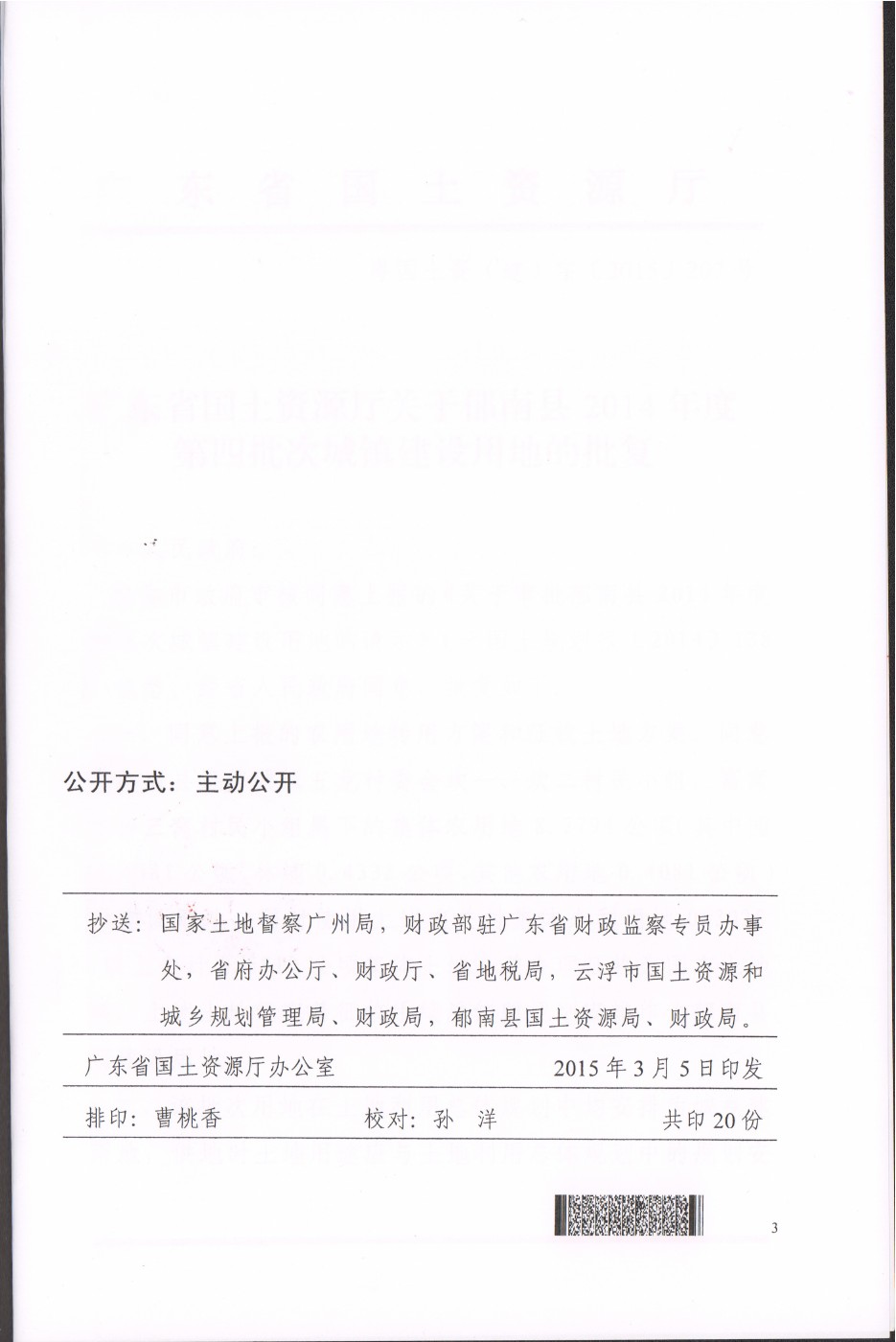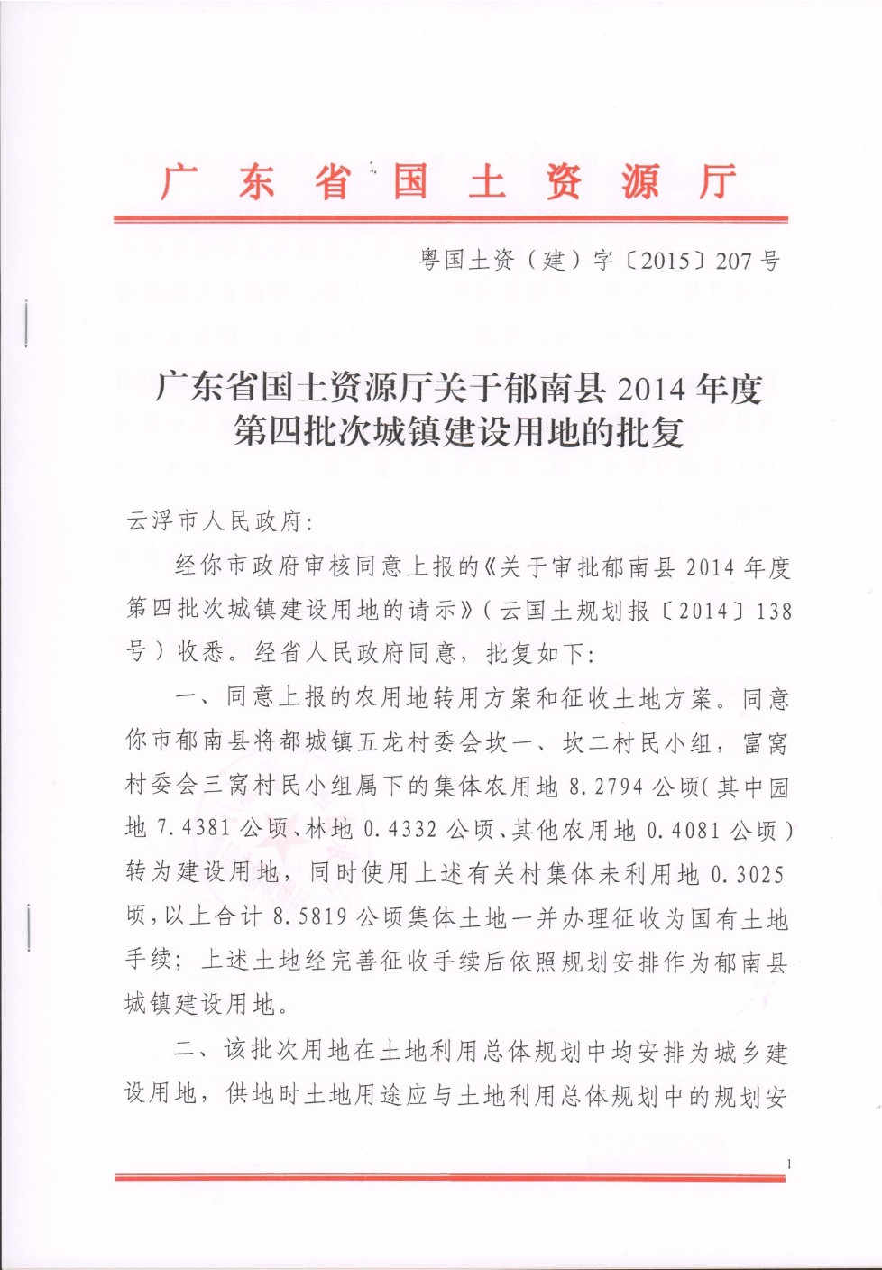 廣東省國土資源廳關(guān)于郁南縣2014年度第四批次城鎮(zhèn)建設(shè)用地的批復(fù)