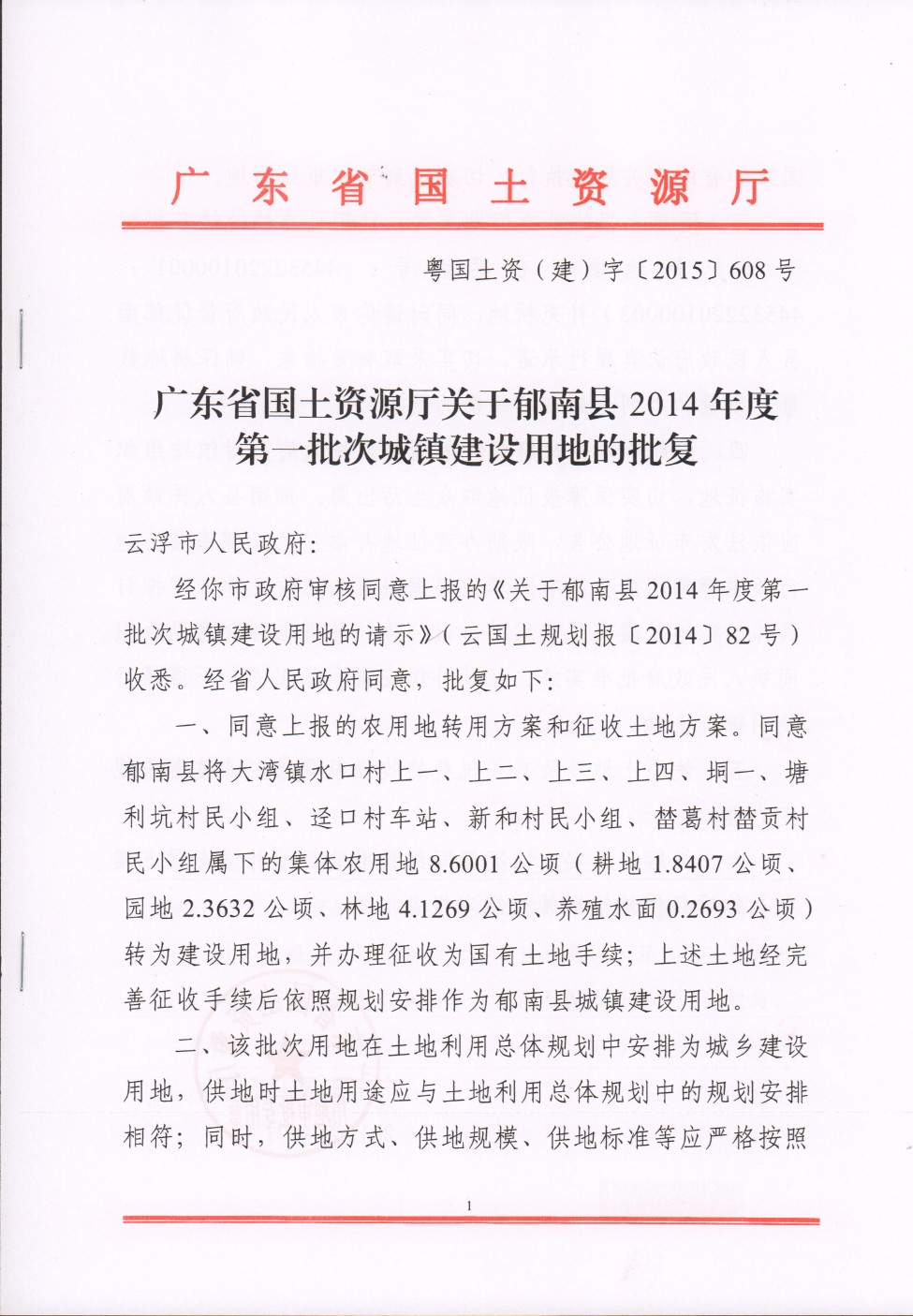 廣東省國土資源廳關(guān)于郁南縣2014年度第一批次城鎮(zhèn)建設(shè)用地的批復(fù)