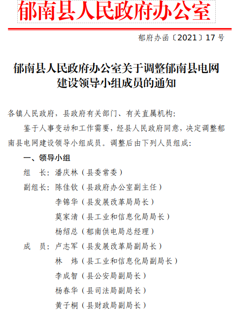 郁南縣人民政府辦公室關于調整郁南縣電網(wǎng)建設領導小組成員的通知(郁府辦函〔2021〕17號)