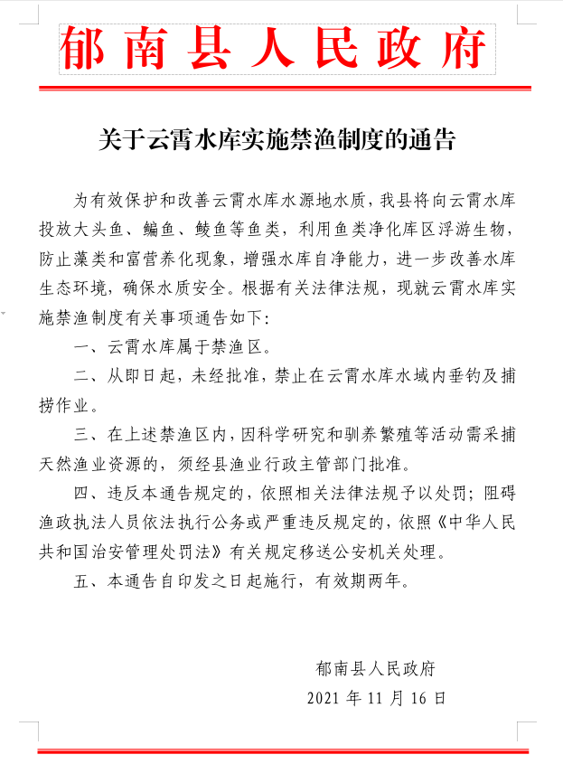 關(guān)于云霄水庫實施禁漁制度的通告